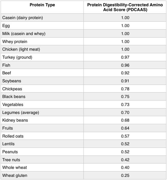 The table below is from the Food and Agricultural Organization of the United Nations World Health Organization. They created a way to measure protein quality based on how complete or incomplete the protein is in each food (amino acid profile) and how well the protein in each food is digested and absorbed. It’s called the protein digestibility-corrected amino acid score (PDCAAS).