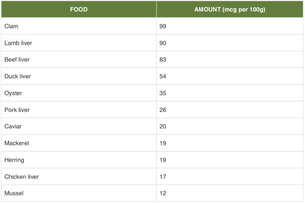 Shellfish and organ meats top the list as they do with a lot of nutrients. They are almost always the most nutrient dense foods you can eat. Muscle meats contain B12 but significantly less than organ meats.